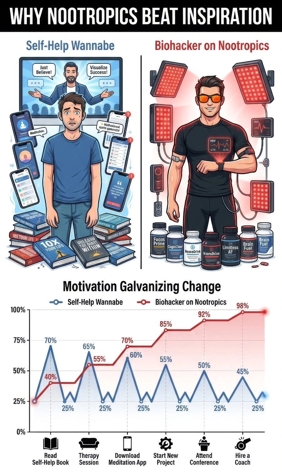 I could make a very long list of benefits of Nootropics (or a giant infographic!), but anyone who has tried them will quickly discover that they do positively affect a multiplicity of measures of performance.