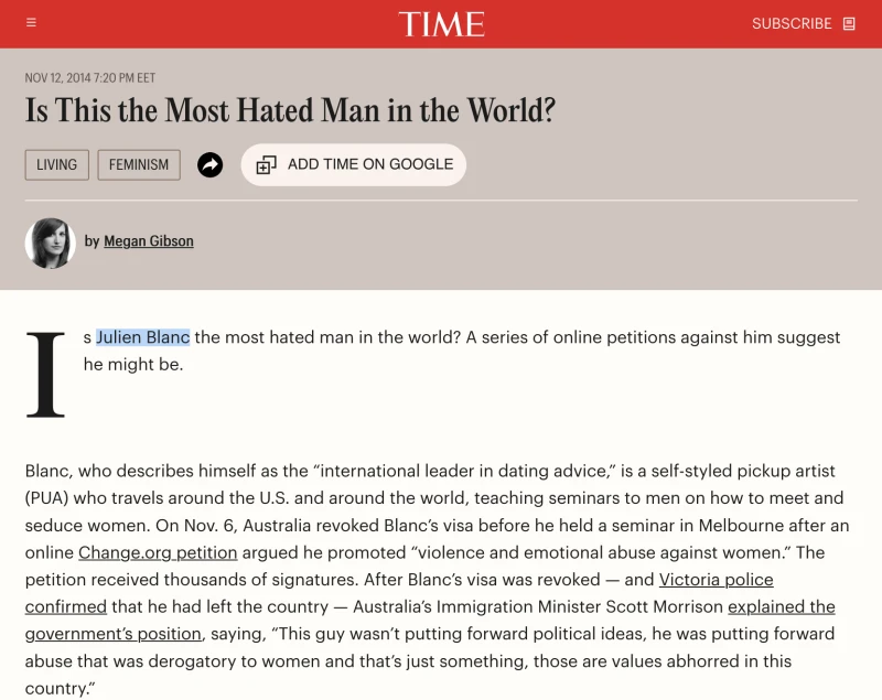 Interestingly, he had worked directly with, at the time, the official most hated man in the world. Weirdly, the most hated man in the world was not some tyrannical dictator or murderous narco boss, but was a douchebaggey pickup artist guru that had pissed off a bunch of feminists and the politically correct mainstream media. My new friend had coached with him and had the photos to prove it. He emphasized how much of an influence this guy was on him.